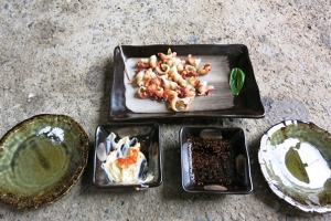 夜のお酒のツマミは、モズクに、アーサーとユリミナーの天ぷら、ユリミナーの刺身でキマリです。