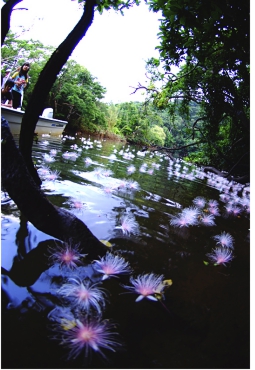 夜から咲き始め、朝には全て木から落ちてしまうという、一夜限りの儚い花なのですが、その散った花が川一面、じゅうたんのよう埋め尽くし流れていく神秘的な景観を作り上げます。