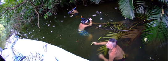 ラティークのサガリ花ツアーはただの遊覧船ではなく、水に入り、サガリ花の半水面や、船で入れない支流での撮影も行っています。
