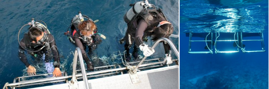 水中まで降りる昇降ステップは、エントリー・エギジットもラクラク。安全です。